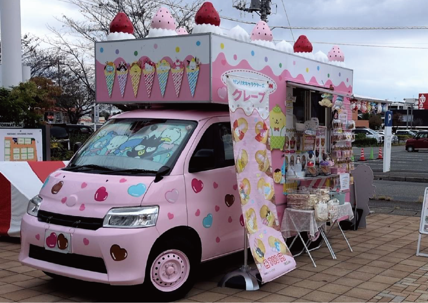 キャラクタークレープは、この車とサンリオカフェ限定「50周年限定フェイス&限定巻紙」を使っています!